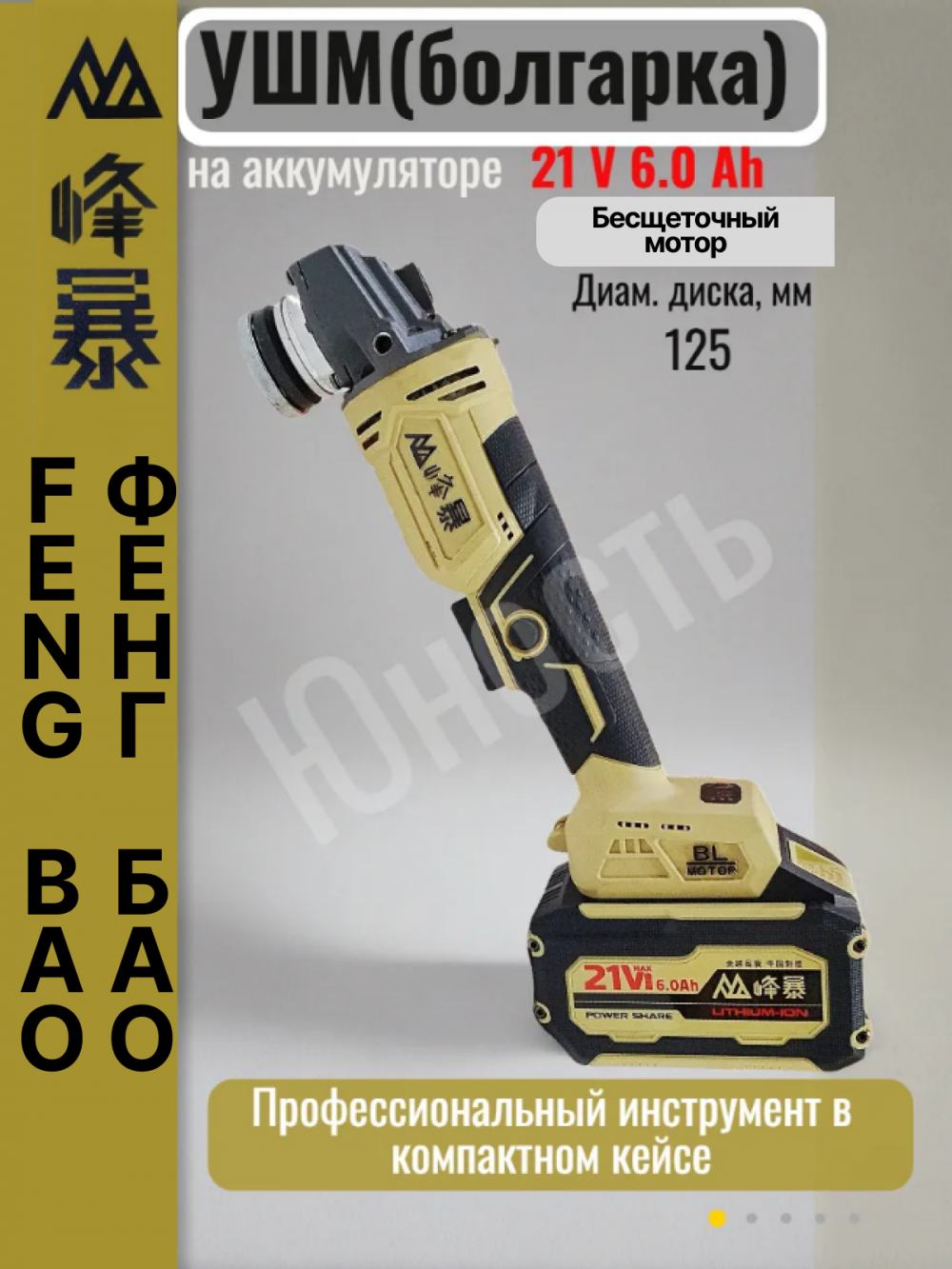 УШМ (болгарка) на АКБ 21 Feng bao(ФЕНГ БАО) – это инструмент, который сочетает в себе комфорт, стиль и высокое качество. Эта модель станет незаменимым помощником как для профессионалов, так и для домашних мастеров, ценящих надежность и удобство в работе. Аккумуляторная конструкция обеспечивает мобильность и свободу действий, позволяя работать в местах без доступа к электросети. Эргономичный дизайн и продуманная конструкция ручки гарантируют комфорт даже при длительном использовании. Модель Feng bao(ФЕНГ БАО) отличается стильным внешним видом, который подчеркнет ваш профессионализм. Высокое качество материалов и сборки гарантирует долгий срок службы инструмента. УШМ (болгарка) на АКБ 21 Feng bao(ФЕНГ БАО) – это оптимальное решение для выполнения различных задач по резке и шлифовке, будь то ремонт, строительство или домашние проекты.Характеристики:Тип двигателя Бесщеточный