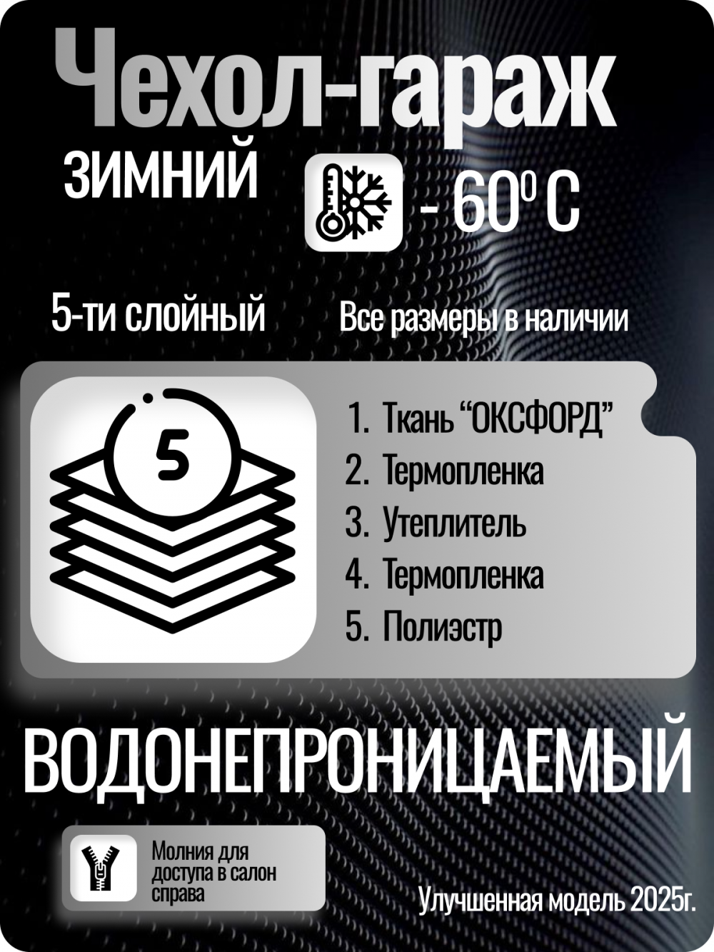 Чехол-гараж зимний обеспечивает надежную защиту автомобиля от осадков, холода и загрязнений. Изготовлен из плотного, водонепроницаемого материала, который выдерживает резкие температурные перепады и сохраняет целостность даже при длительном хранении.