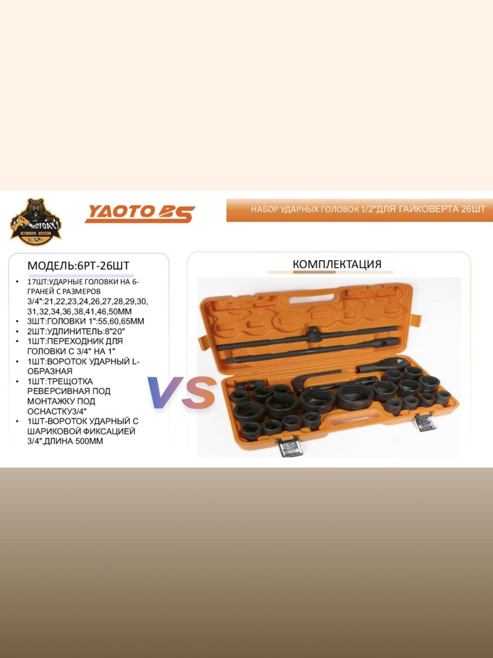 Набор ударных головок YAOTO BS — незаменимый помощник для любого автовладельца или любителя авторемонта. Этот набор включает в себя широкий диапазон головок от 21 до 65 мм, что позволяет справиться с большинством задач по ремонту и обслуживанию автомобиля. Изготовленные из прочного материала, головки YAOTO BS обеспечивают надежное сцепление и долгий срок службы. Компактный кейс для хранения упрощает транспортировку и организацию инструментов. С этим набором вы всегда будете готовы к любым неожиданностям на дороге или в гараже.