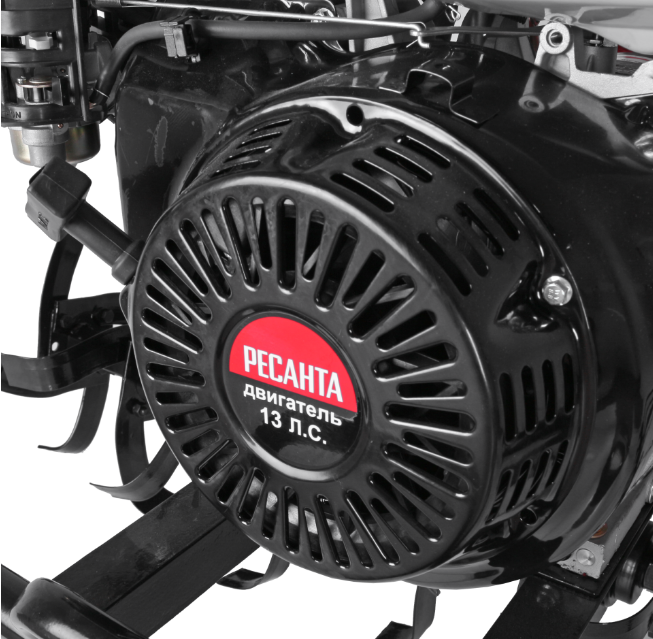 Мотоблок МБ-13000Р Ресанта – это мощная техника, которая упрощает обработку земли, хотя также может использоваться и для других целей, например, для перевозки грузов. За высокую производительность отвечает бензиновый двигатель мощностью 13 л. с. Модель отличается экономным потреблением топлива – всего 375 г/кВт в час. Благодаря тому, что бак вмещает 3,6 л, можно долгое время работать без дозаправки.